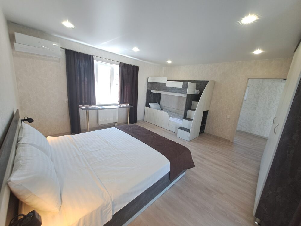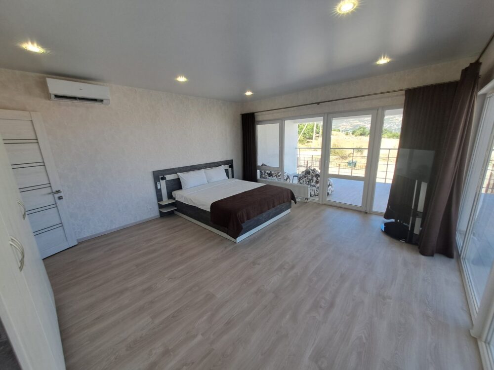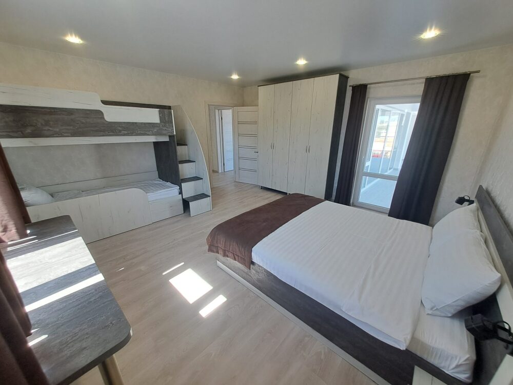 На 2 этаже: 2 спальни с большими кроватями + 2-х ярусная кровать для детей, с балконами.