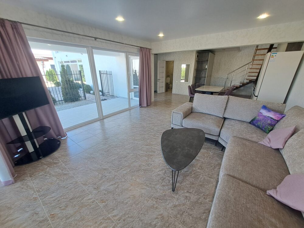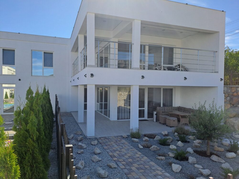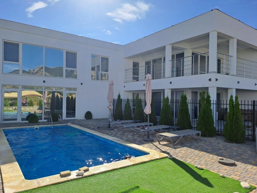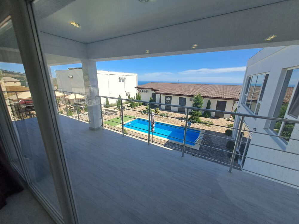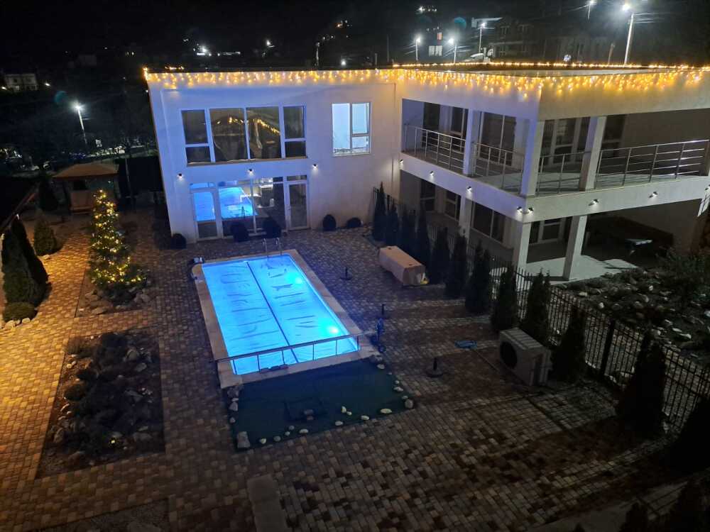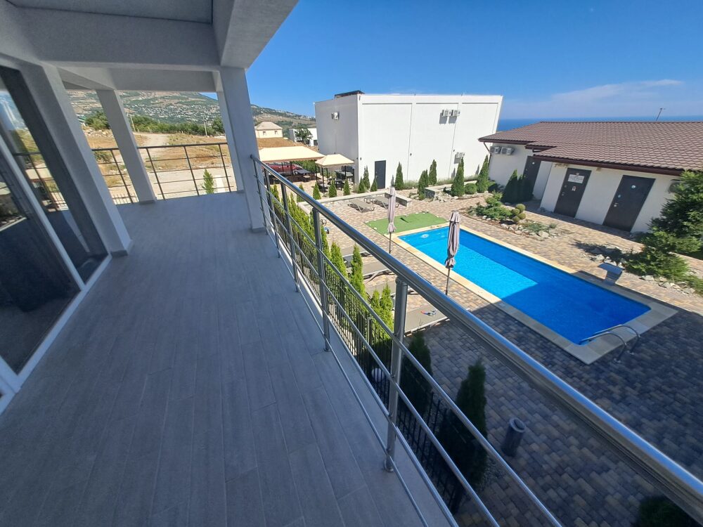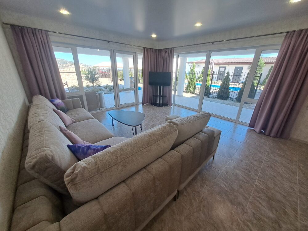 Сдаётся новая вилла с общим бассейном в гостевом комплексе "Горная лаванда" в Алуште. В общем бассейне: подогрев, противоток, гидромассаж, водопад, подсветка RGB. Бассейн с подогревом. Релакс зона: лежаки, столики, зонты у бассейна.
