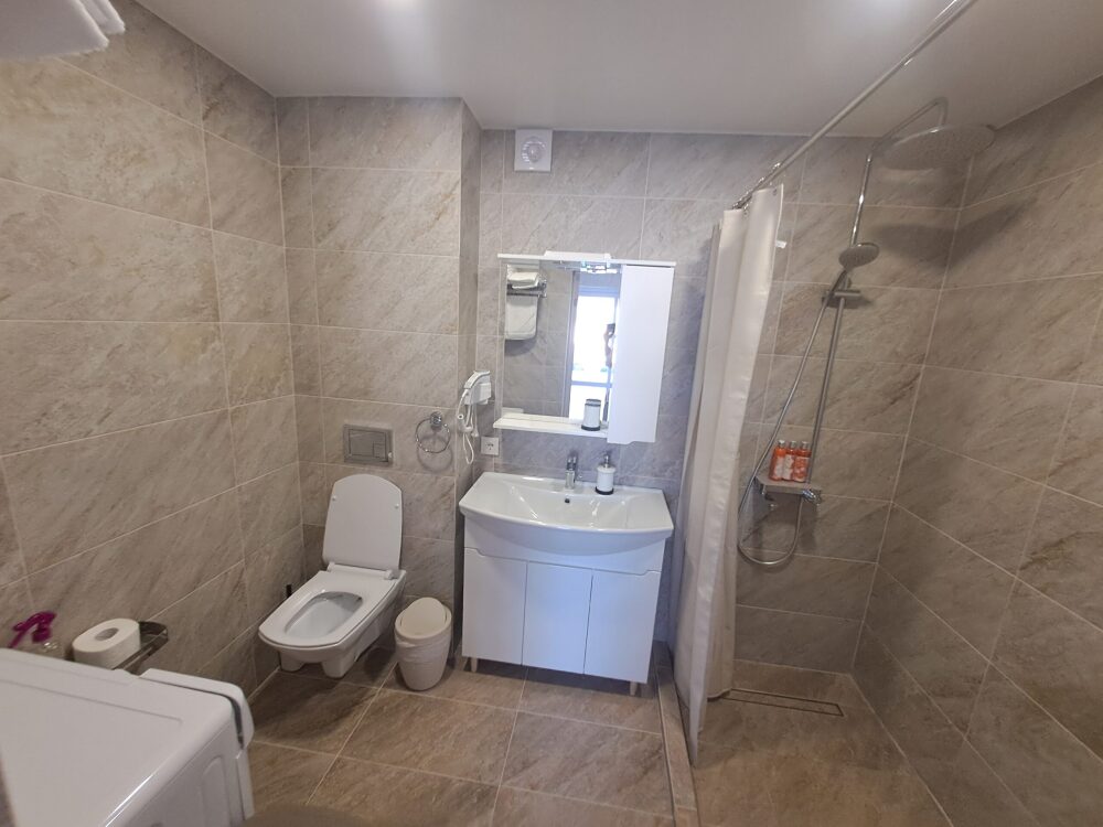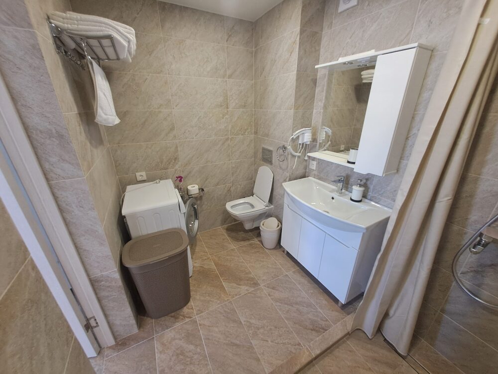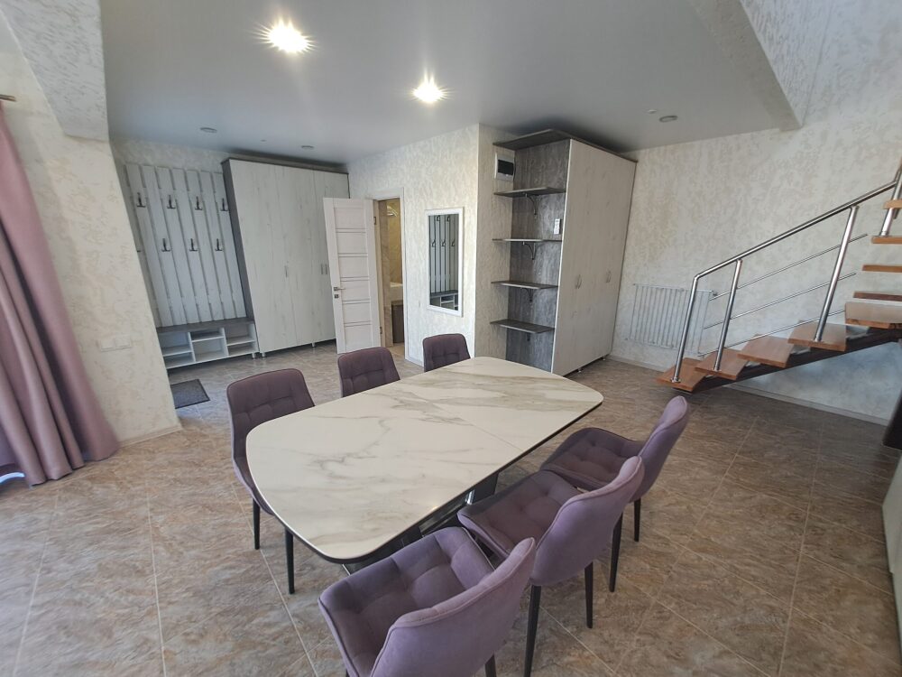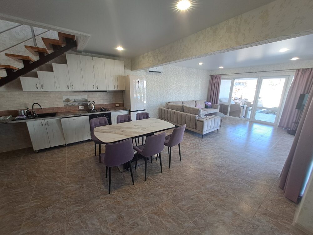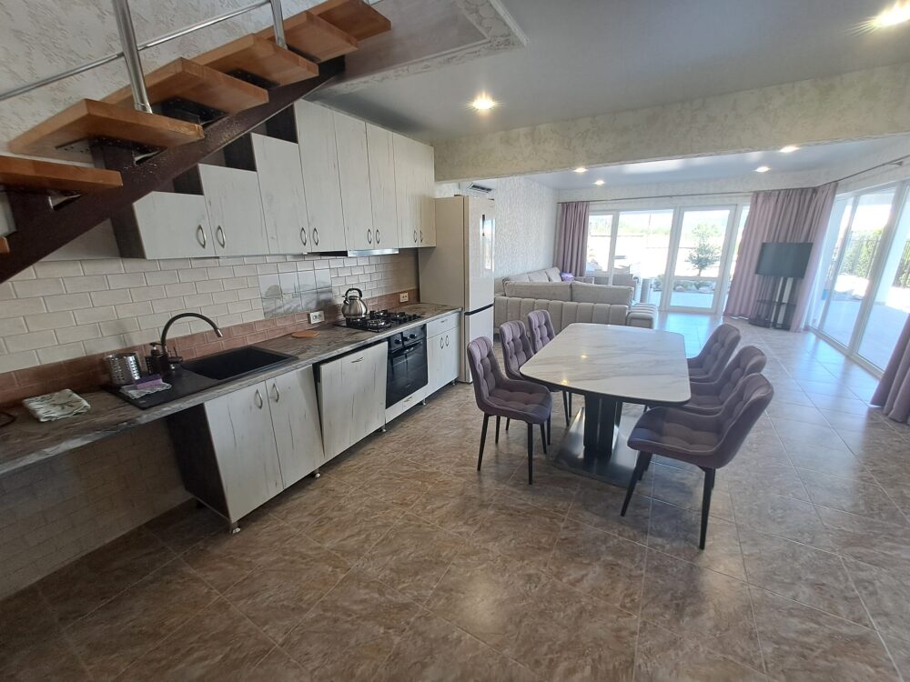 На 1 этаже: прихожая, большая гостиная, санузел с душем и стиральной машинкой. Кухня оборудована: посудомойка, плита, духовка, микроволновка, кофеварка, холодильник, посуда.