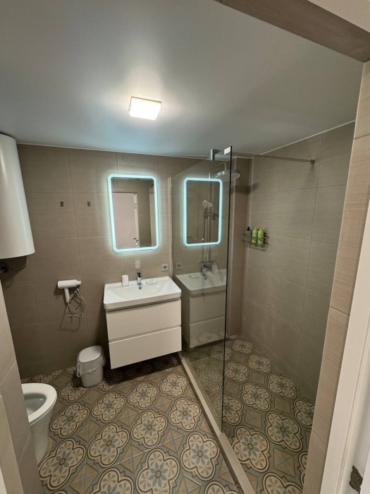 - Кухня: большой обеденный стол с комфортными стульями, холодильник, микроволновая печь, индукционная плита, чайник, капсульная кофемашина Nespresso с капсулами, чай, кофе, питьевая вода и вся необходимая посуда.