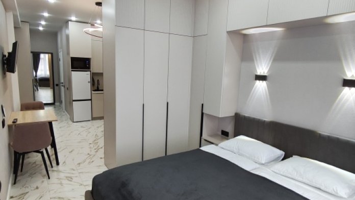 - Полностью оборудованная кухня: посуда, индукционная плита, холодильник с мoрoзильнoй кaмеpoй, микроволновка, электрический чайник.