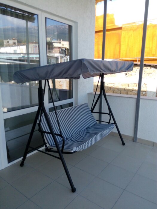 На террасе качеля. Есть мангал. Дом построен так, что четвёртый этаж получается как первый, вход с земли, где парковка машины.