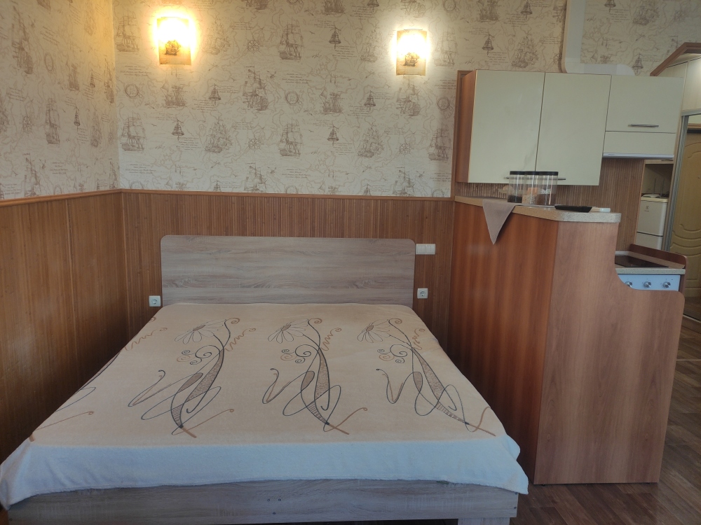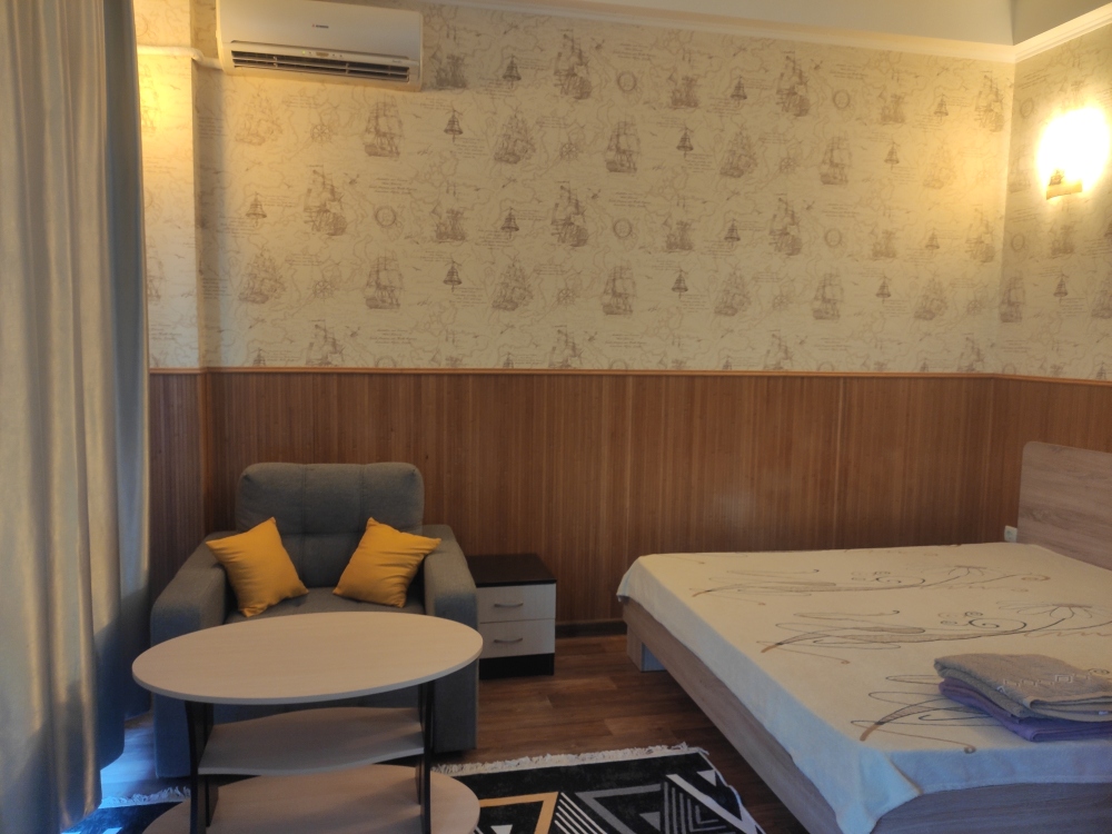 Пространство и комфорт: В уютной студии Вас ждет большая двуспальная кровать для сладких снов и удобное раскладное кресло-диван, которое легко превращается в дополнительное спальное место.