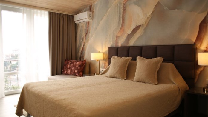 Большой комфортный номер-студия 38,1 кв. м с 2 не изолированными комнатами, с видом на горы, оборудован всем необходимым для отдыха. В номере: двуспальная кровать, Диван 3-местный, 2 Балкона, 2 - TV, Wi-Fi.