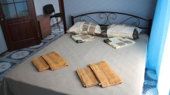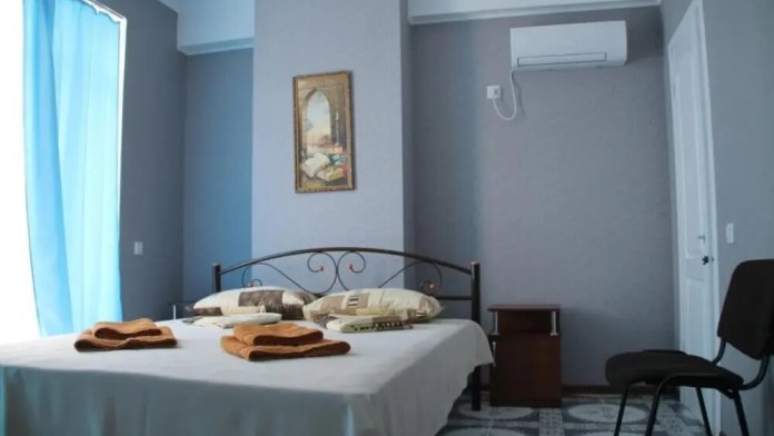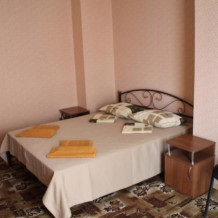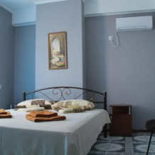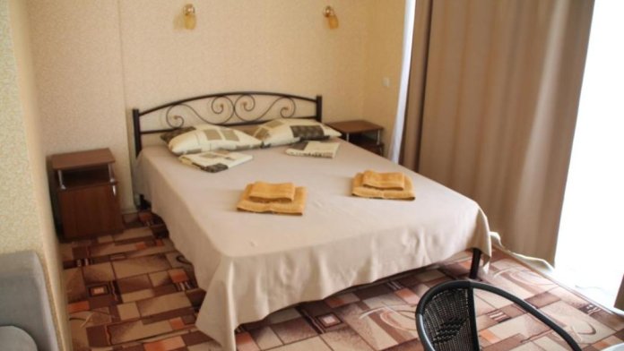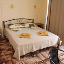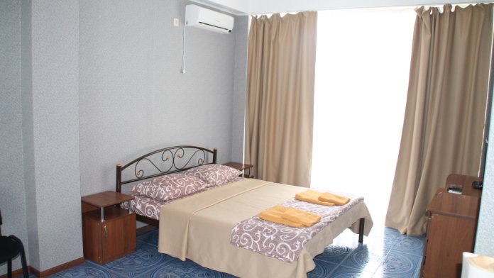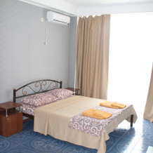 Большой номер с 2-спальной кроватью и диваном. В номере: шкаф-купе, комод, тумбочки, набор посуды, ТВ, холодильник, кондиционер. Большой балкон. Вид сектором на море.