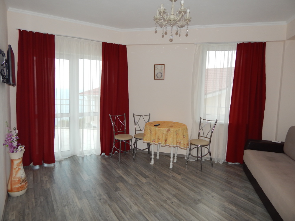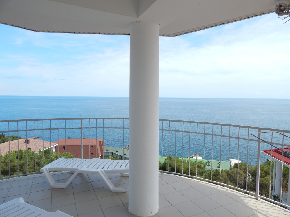 Большие панорамные окна с выходом на балкон, ширина которого 20 м, со столиком, где можно выпить утренний кофе и насладиться видом на море и горы.