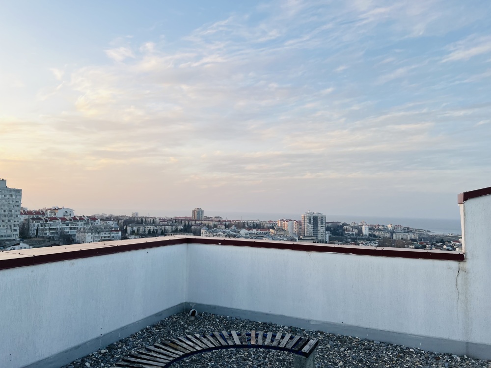 Открытый балкон с видом на город и море вдалеке, уютный французский балкончик во двор.