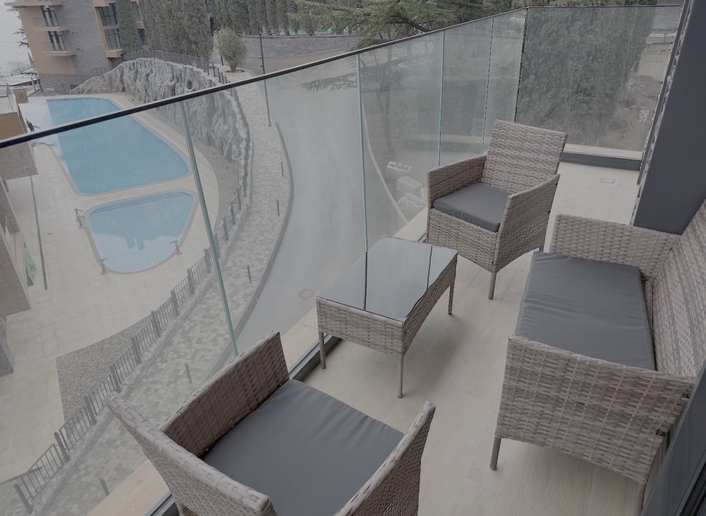 Панорамный балкон открывает потрясающие виды на Чёрное море и благоустроенную территорию с бассейном с подогревом воды, позволяя наслаждаться отдыхом круглый год.