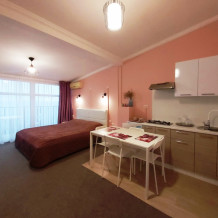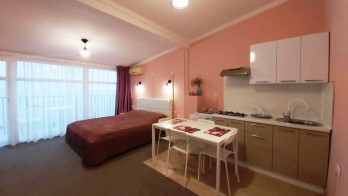 Терраса с прямым видом на море (стол и стулья), 4 спальных места, две комнаты (спальня и детская). Спальня двухспальная кровать, в детской комнате раскладной диван. Телевизор LCD, кондиционер, холодильник, электрочайник. Санузел (душевая кабина). Wi-Fi (интернет). Прямой вид на море видовая площадка. Фильтрованная вода бесплатно.