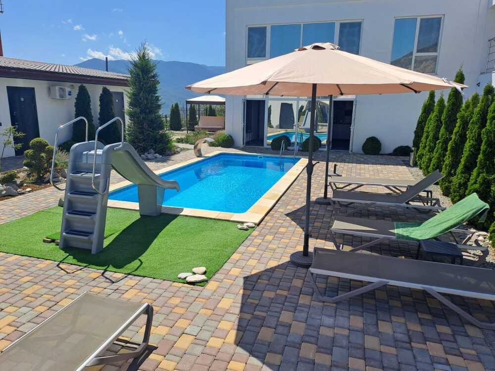Мангал. Лежаки, столики и зонты у бассейна.