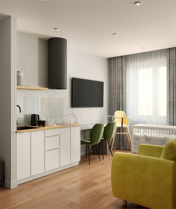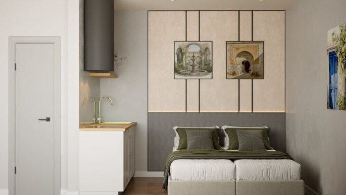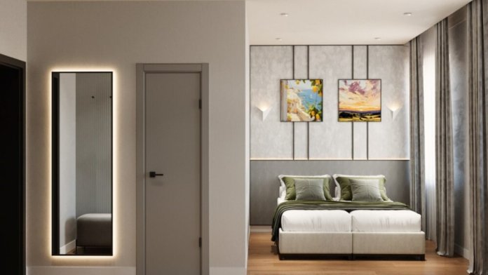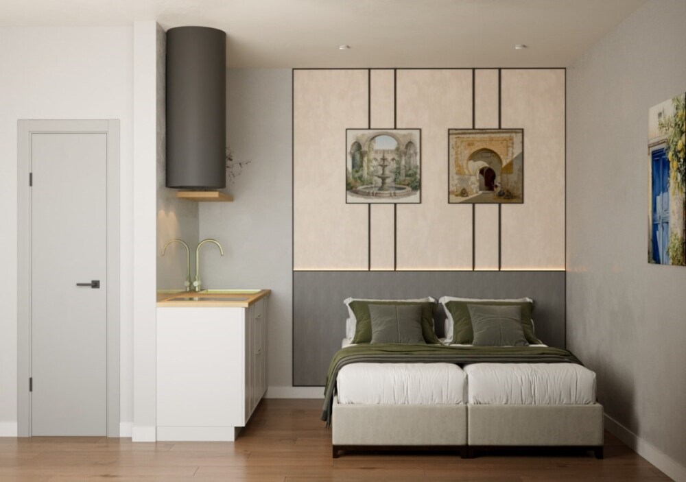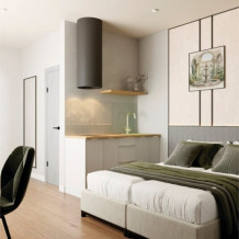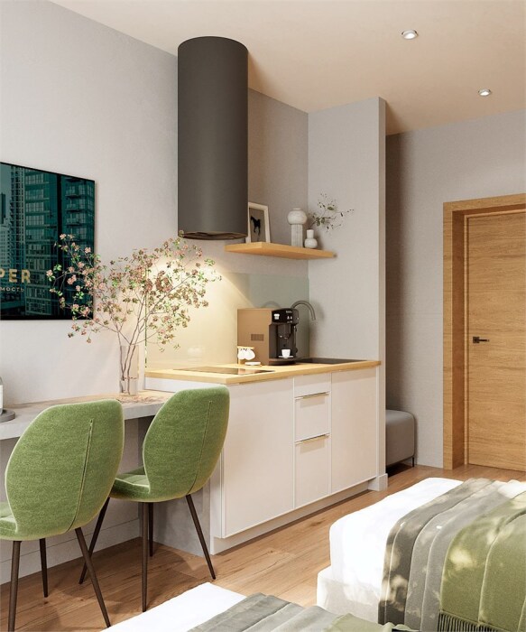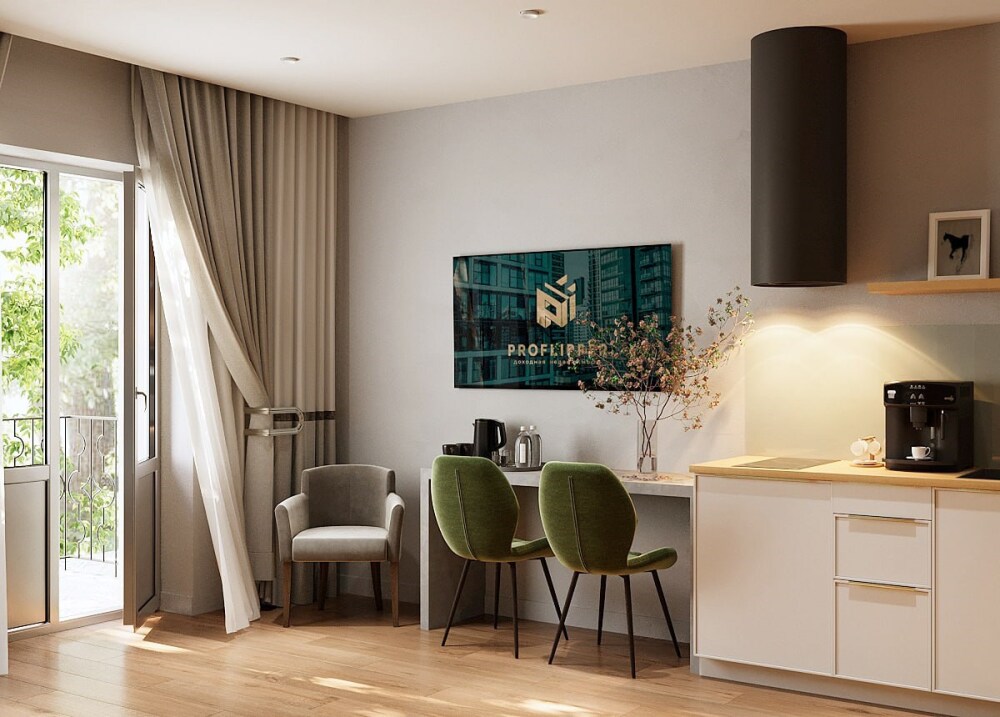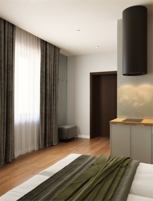 В номере одна большая двуспальная кровать (160*200 см) или две односпальные кровати (80*200 см), есть все необходимые для комфортного проживания – телевизор с плоским экраном, Wi-Fi, мини-кухня с индукционной плитой, вытяжкой и набором посуды, чайный островок, мини-холодильник, сейф, кондиционер, санузел с душевой, фен, водонагреватель, косметические средства, тапочки, набор полотенец для каждого гостя, махровые халаты, электронные замки, зеркало с подсветкой в полный рост. Есть отдельная рабочая зона.
