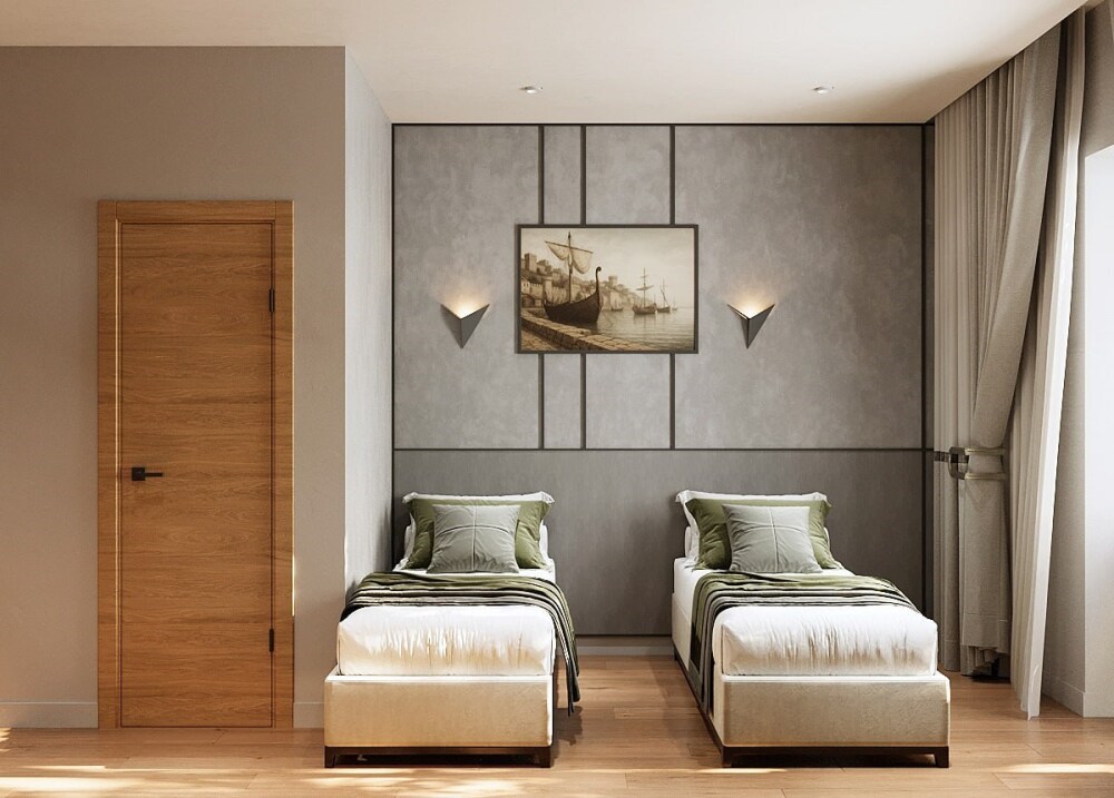 В номере располагаются 2 односпальные кровати (80*200), которые могут трансформироваться в большую кровать (160*200) . Телевизор с плоским экраном, Wi-Fi, мини-кухня с индукционной плитой, вытяжкой и набором посуды, чайная станция, мини-холодильник, сейф, кондиционер, санузел с душевой, фен, водонагреватель, косметические средства, тапочки, набор полотенец для каждого гостя, махровые халаты, электронные замки, зеркало с подсветкой в полный рост.