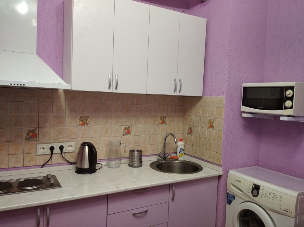 Кухня с электрической плитой, холодильником, микроволновой печью, электрочайником, необходимой посудой, холодной и горячей водой (постоянно).