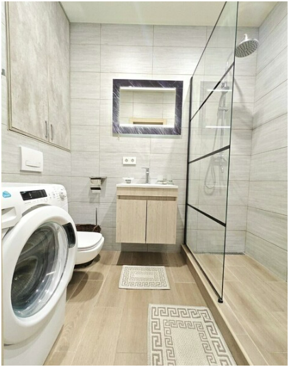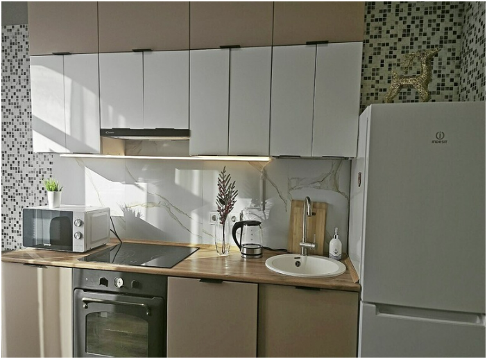 Техника: 2 кондиционера, холодильник, стиральная машинка, плита, микроволновка, ТВ.