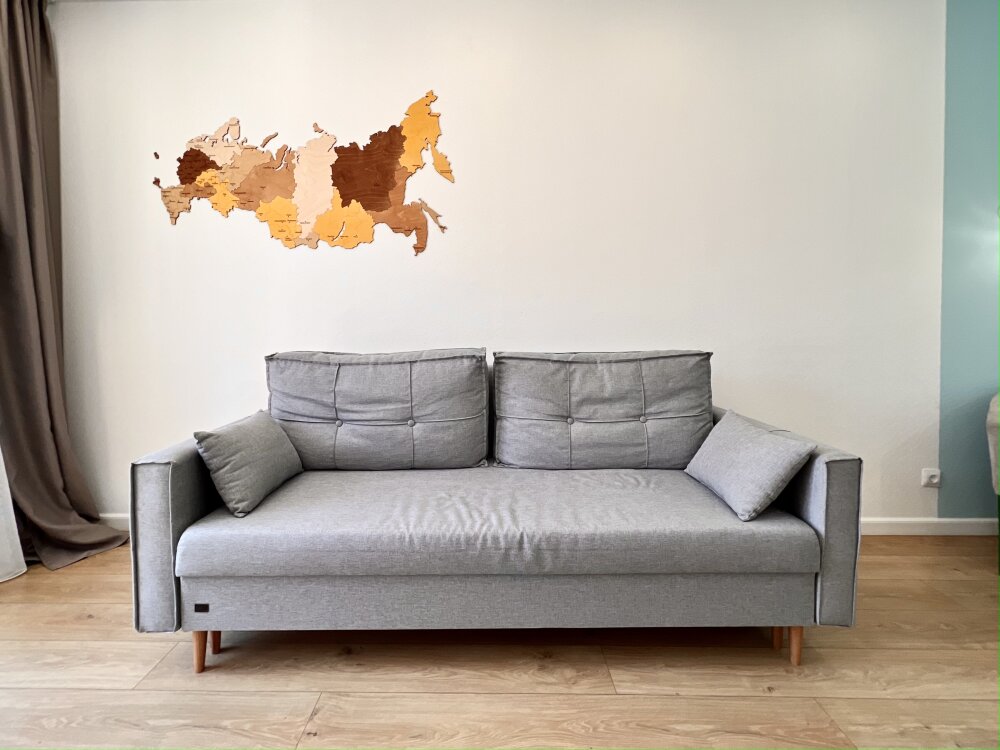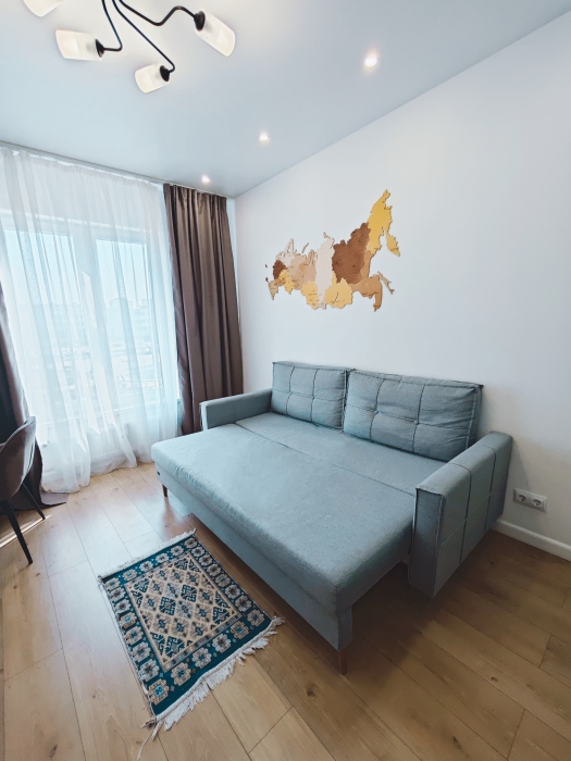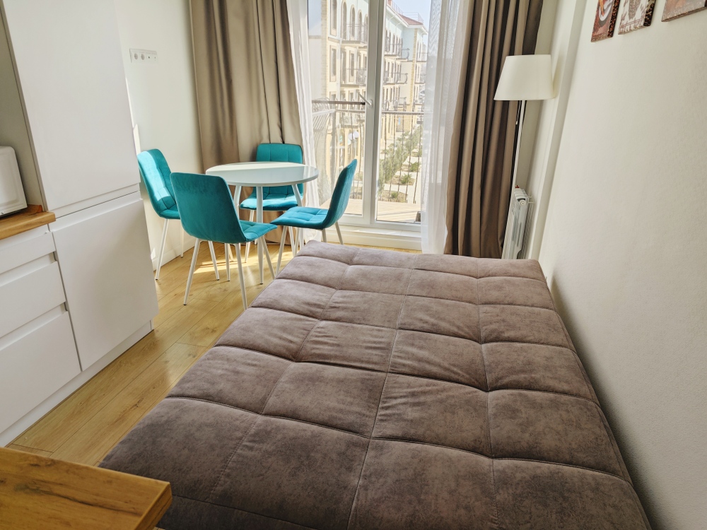 Комплектация: в спальне 2-спальная кровать, 2-спальный диван, на кухне-гостиной 2-спальный диван.