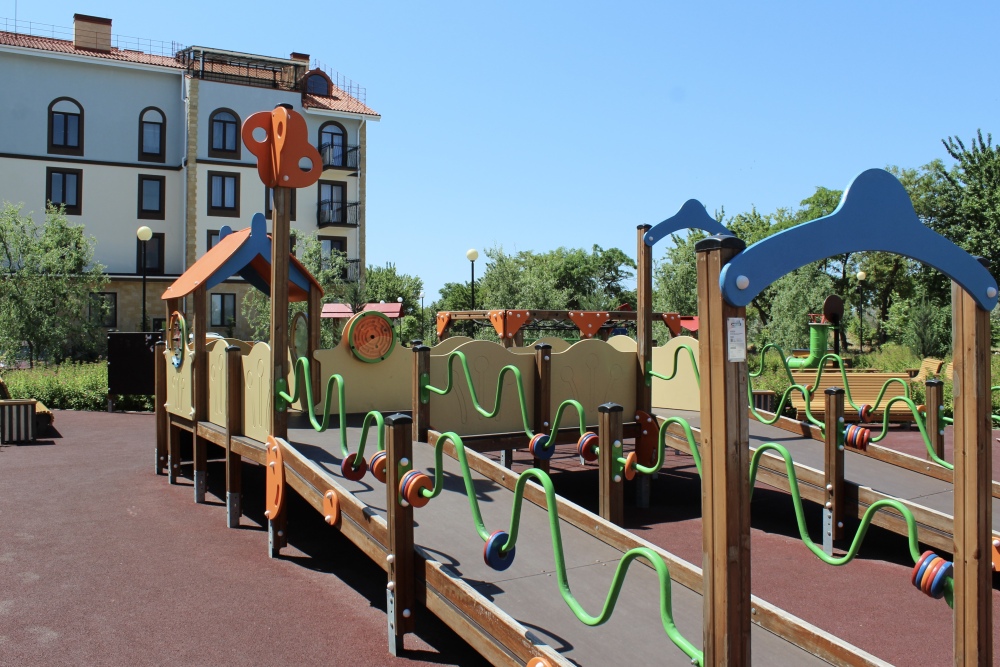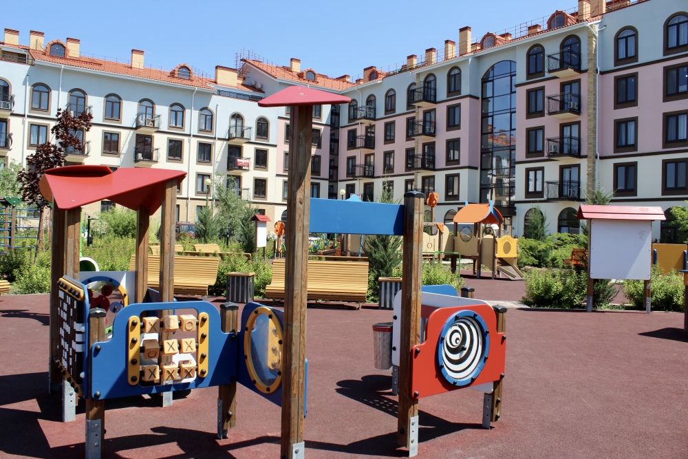Комплекс ЖК «Евпатория» сделан в стиле итальянского квартала с часовой башней. Вся территория с видеонаблюдением, много детских площадок, спортплощадок. Пешеходная зона без автомобилей. Просторные парковки. Территория утопает в розах.
