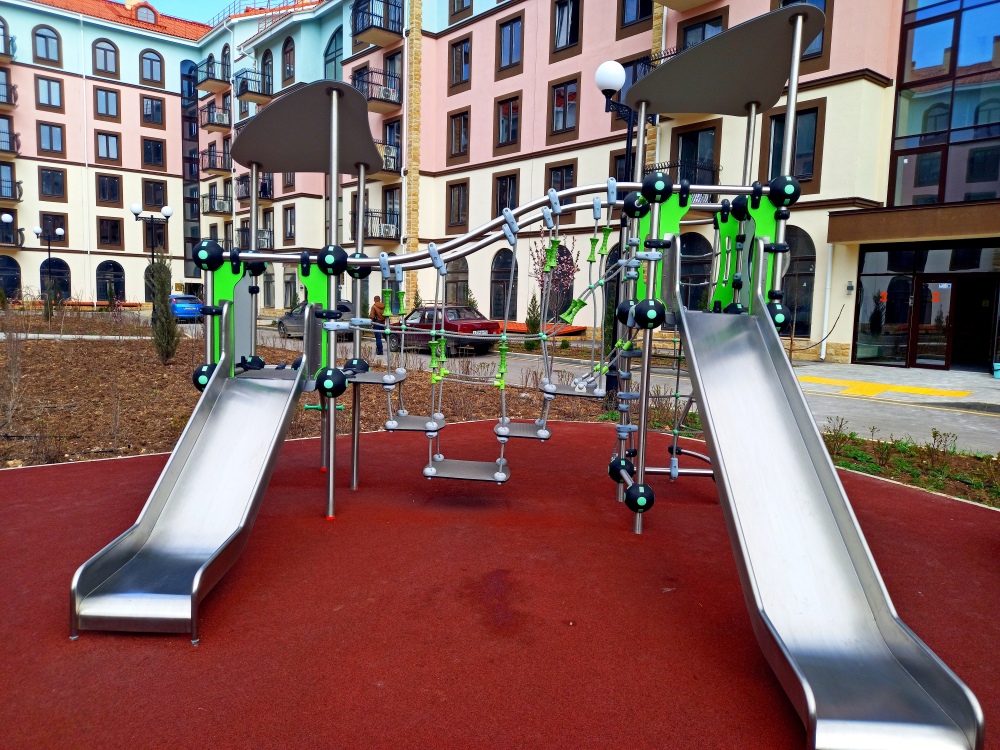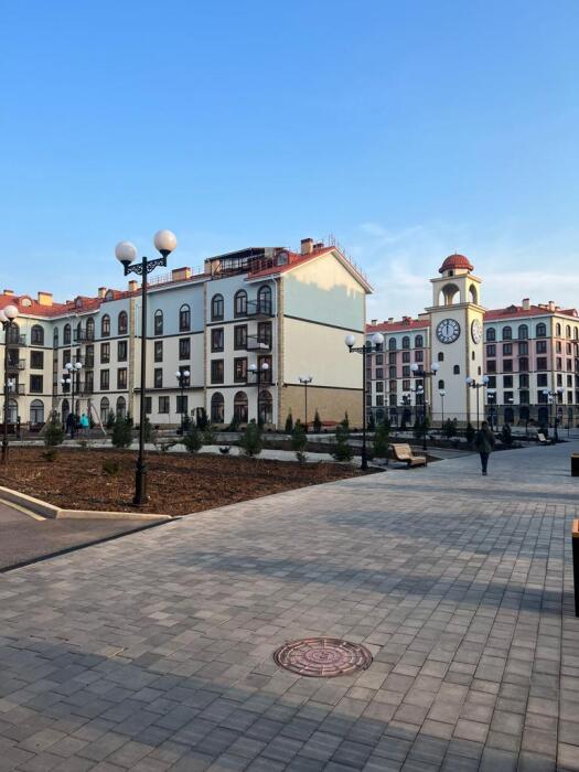 Комплекс ЖК «Евпатория» сделан в стиле итальянского квартала с часовой башней. Вся территория с видеонаблюдением, много детских площадок, спортплощадок. Пешеходная зона без автомобилей. Просторные парковки. Территория утопает в розах.