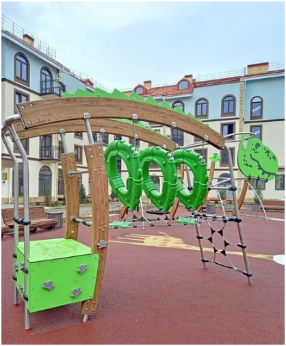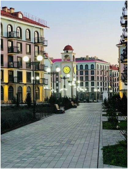 Комплекс ЖК «Евпатория» сделан в стиле итальянского квартала с часовой башней. Вся территория с видеонаблюдением, много детских площадок, спортплощадок. Пешеходная зона без автомобилей. Просторные парковки. Территория утопает в розах.