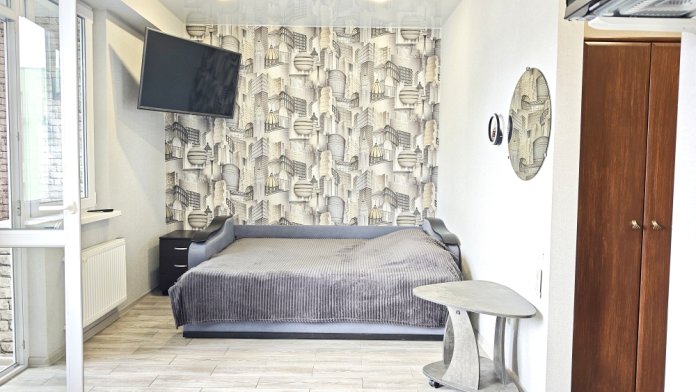 Студия рассчитана на комфортное размещение 2-3 человек. Двуспальный диван + раскладное кресло (полноценное спальное место), расположенное на отапливаемом балконе.