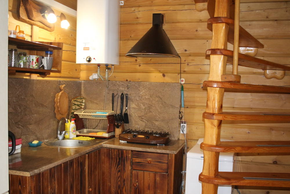 На первом этаже кухня-столовая со столиками и диваном, стиральной машиной. На кухне посуда, чайник, газовая плита, холодильник, микроволновка.
