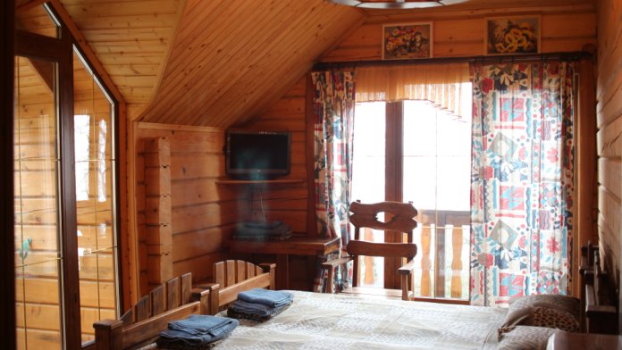 Номер на втором этаже двухэтажного деревянного сруба с балконами, на этаже один душ-туалет на два номера ( удобно для семьи из 4 - 6 человек).