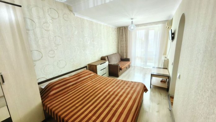 — двуспальная кровать и двуспальный диван-кровать, необходимая мебель,