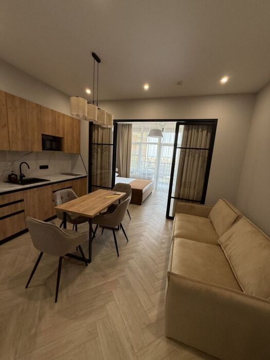 Уютная гостиная с диваном и полностью оборудованной кухней.