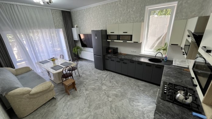 В доме (своя личная кухня - гостиная с полным комплектом посуды и мягкой мебели ,с собственным холодильником,газовой плитой- духовкой и микроволновкой. Внутри коттеджа собственный санузел , а также три отдельные комнаты с новой мебелью, в каждой комнате собственный кондиционер и телевизор.