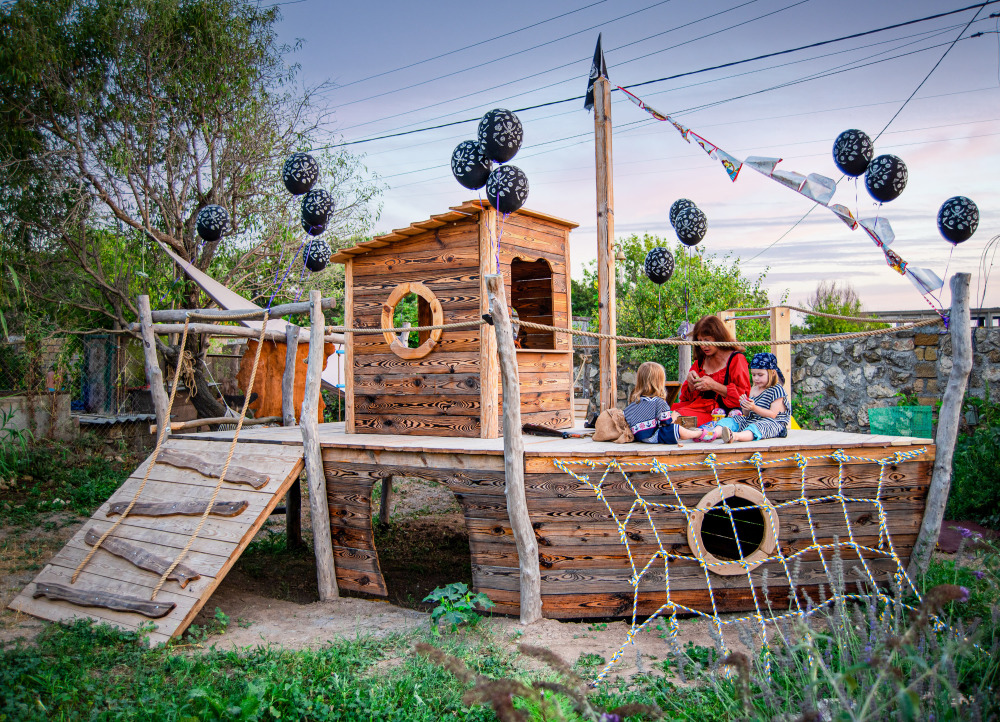 Закрытый зелёный двор с детской площадкой в виде пиратского корабля, батутом, мангалом и зоной отдыха.