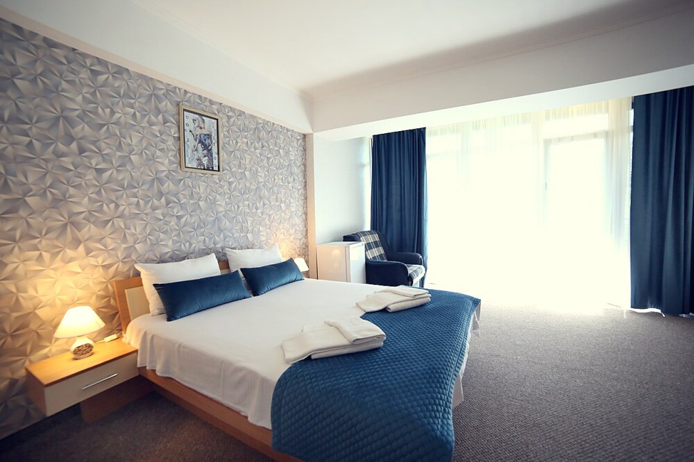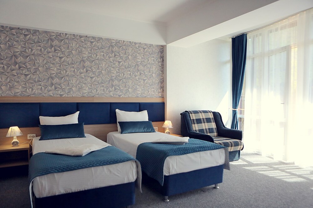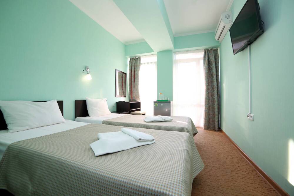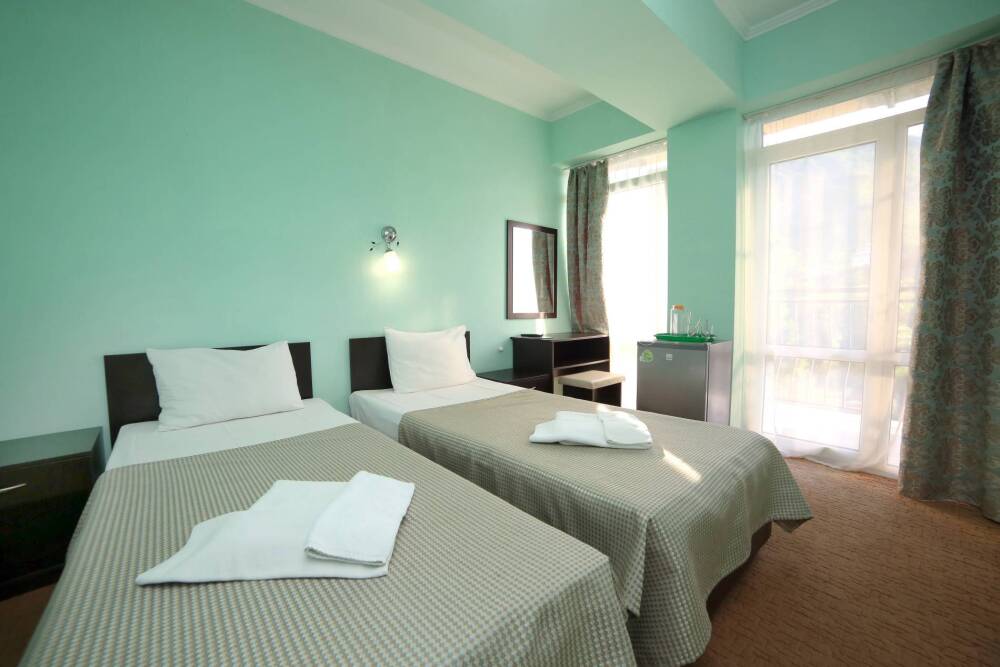 Двухместный номер с балконом и видом на Медведь-гору или на теневую сторону. В номере кондиционер, холодильник, телевизор,wi-fi. Размещение twin или double. Один ребёнок до 7 лет — можно без отдельного спального