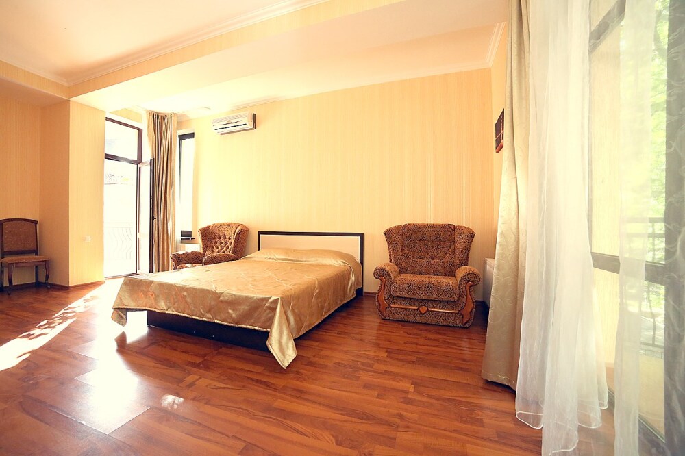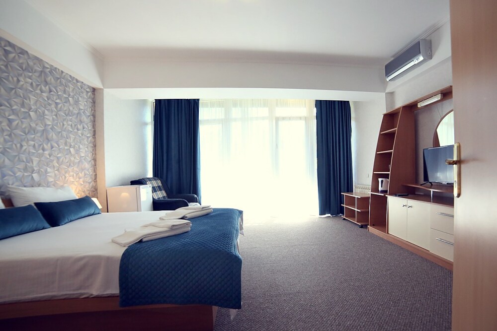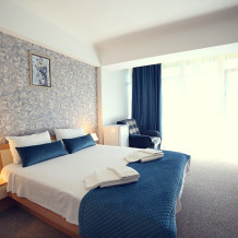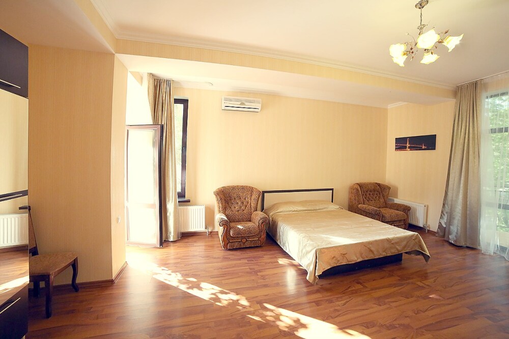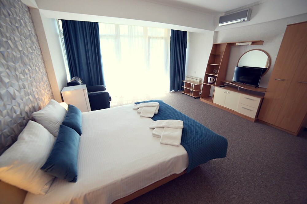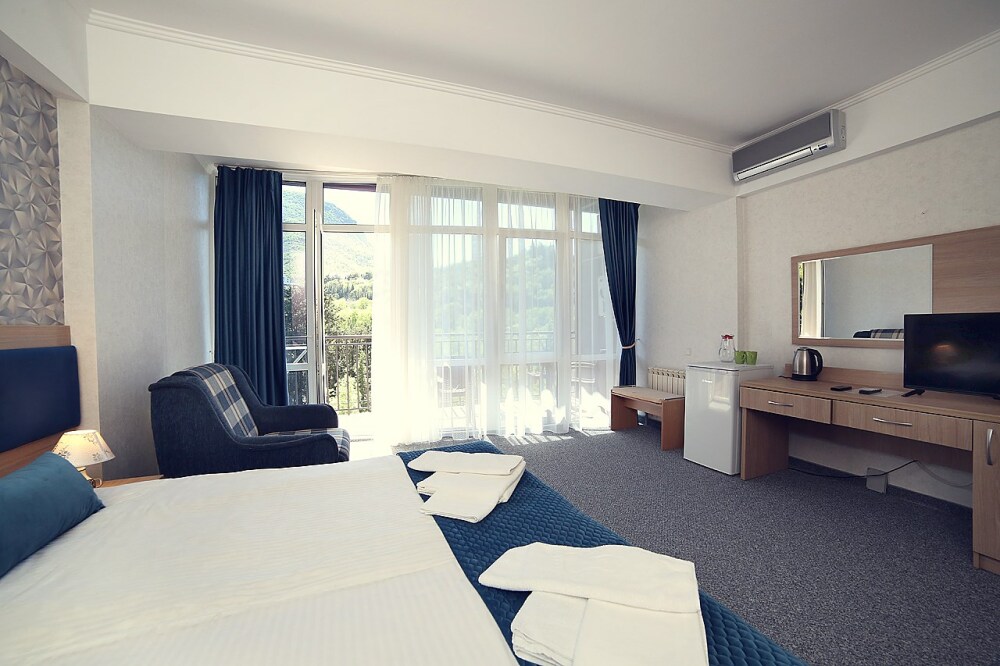 Просторный номер с балконом и видом на Медведь-гору. Или без балкона. В каждом номере кондиционер, телевизор, чайник, холодильник. Удобства в номере. Размещение на двуспальной кровати и раскладном кресле. Один ребёнок до 7 лет — можно без отдельного спального