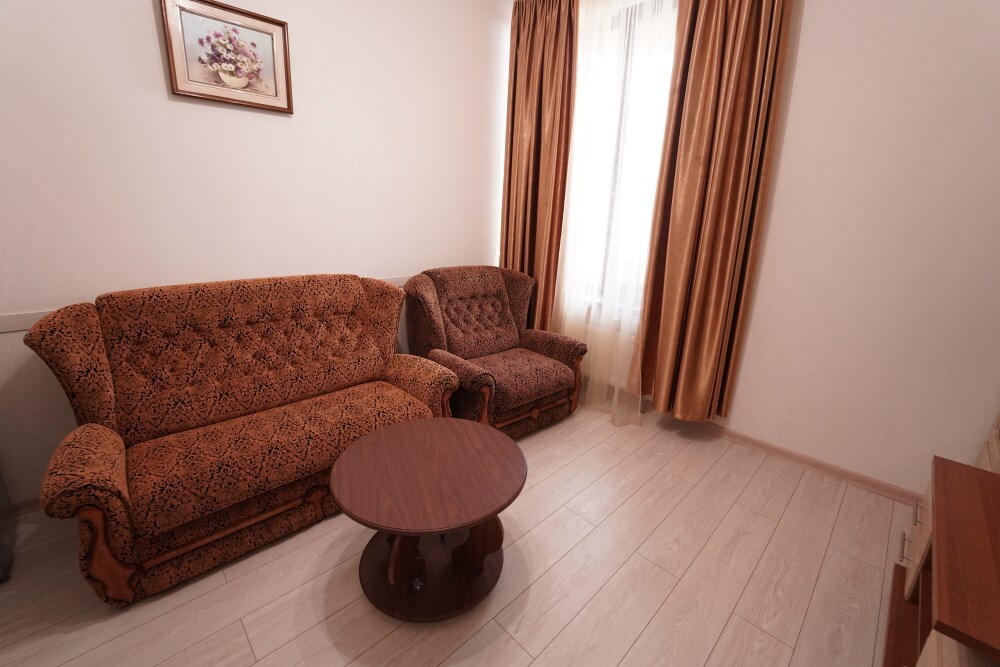 Двухкомнатный номер с собственной ванной комнатой. В номере кондиционер, телевизор, чайник, холодильник. Размещение на двуспальной кровати в одной комнате и раскладном диване в другой. Один ребёнок до 7 лет — можно без отдельного спального