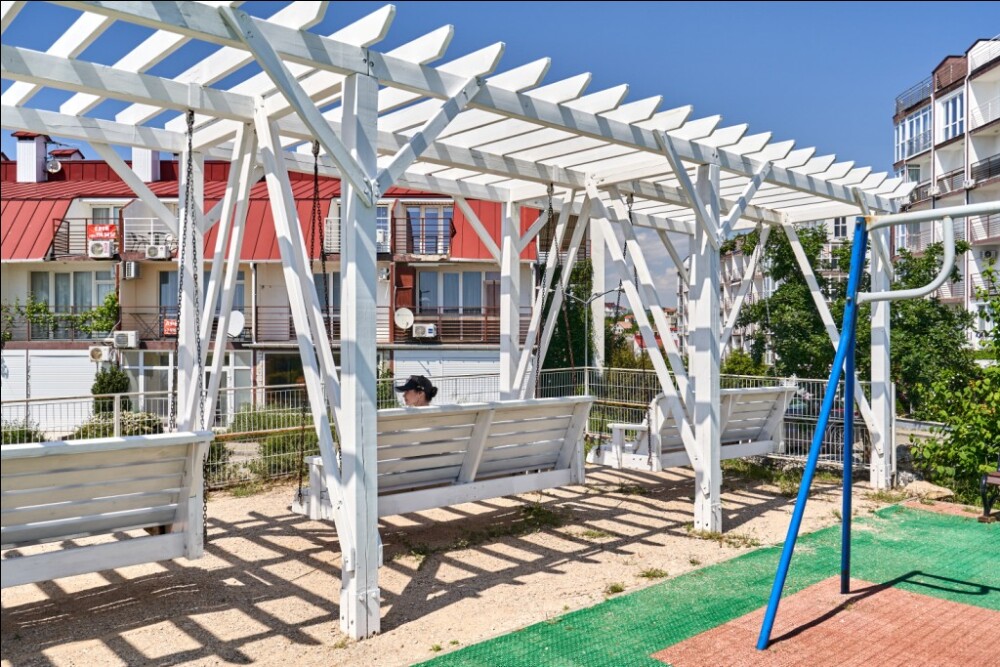 На территории жилого комплекса есть детская площадка, ресторан «Фиолент», мангальная зона и видовые качели для фотосессий!