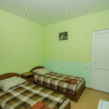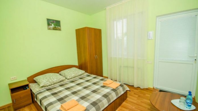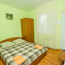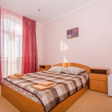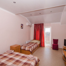 Удобная комната с французским балконом выходит во внутренний дворик, оснащена двуспальной и полуторной кроватями , платяным шкафом, прикроватной тумбочкой, стульями, журнальным столиком, холодильником и телевизором.