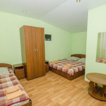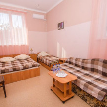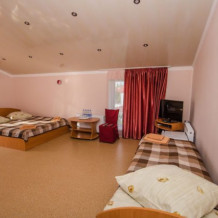 В номере – две полуторных кровати и двуспальная, раскладное кресло, платяной шкаф, прикроватные тумбочки, стулья, холодильник и телевизор, кондиционер, санузел. Пятое место оплачивается как дополнительное.