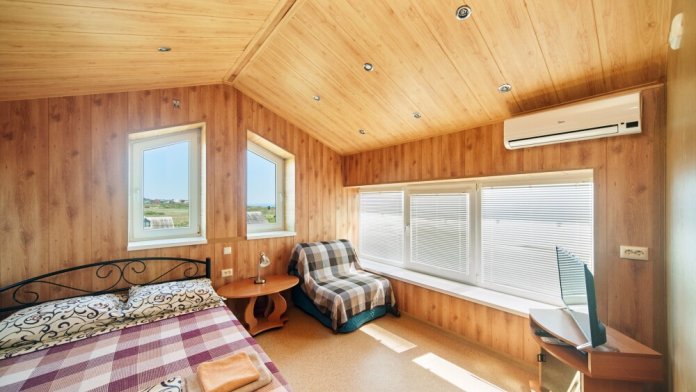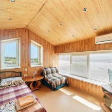 Просторная комната с выходом к бассейну для семьи из 4-5 человек оборудован двуспальной и полуторной кроватями, платяным шкафом, прикроватными тумбочками, стульями, журнальным столиком, холодильником, телевизором, кондиционером и санузлом. Рядом с комнатой находится свое место для отдыха- стол и кресла, качели.