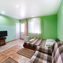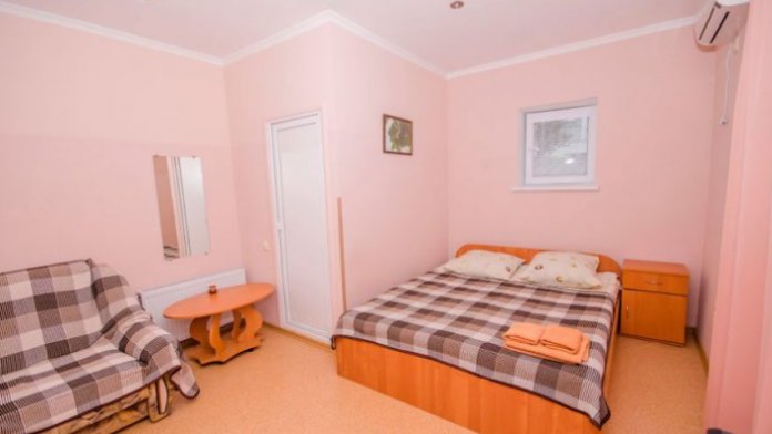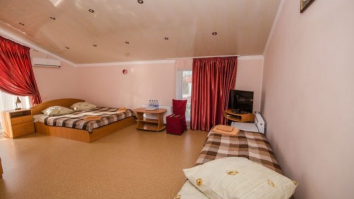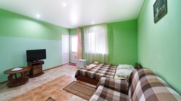 Комната оборудован двумя кроватями - полуторной и двуспальной, раскладным двуспальным диваном, платяным шкафом, прикроватными тумбочками, стульями, холодильником и телевизором, кондиционером.