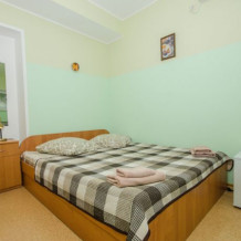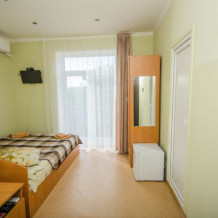 В комнате расположены двуспальная кровать, раскладное кресло, платяной шкаф, прикроватная тумбочка, журнальный столик, холодильник, телевизор, кондиционер. В комнате может разместиться до 3 человек.
