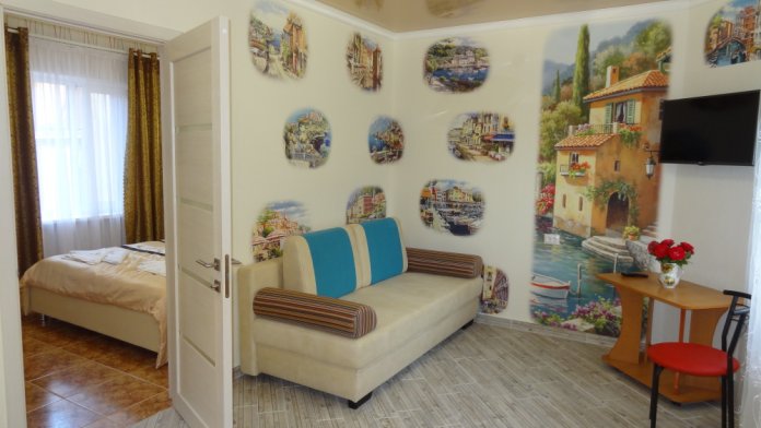 Комфортный номер с мини-кухней и гостевой зоной с диван-кроватью, а также с двумя отдельными спальными комнатами. В одной комнате две односпальные кровати, а в другой комнате три односпальные кровати. Раздельный санузел.