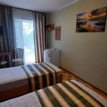 В номерах удобный стол и для трапезы и для любителей работать он-лайн в тишине и на природе. Не так часто встретишь такой вариант даже в номерах Люкс, занимает много площади в номерах.