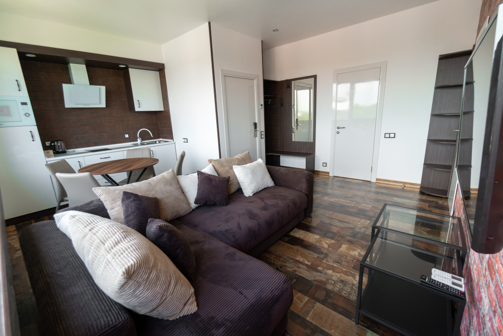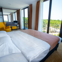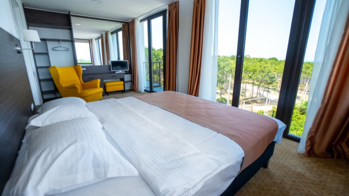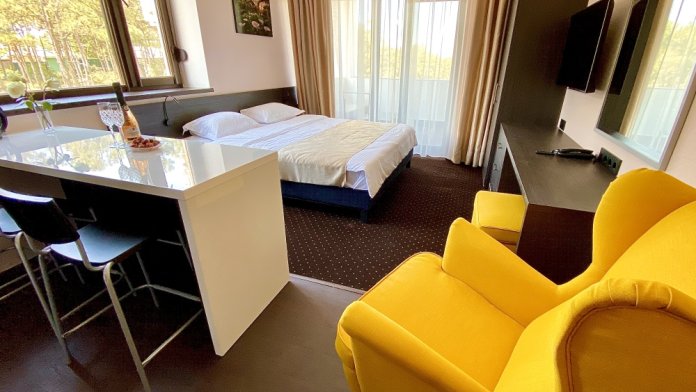Двухкомнатный номер с понорамными окнами в пол из которых открывается великолепный вид на море.