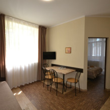 В каждом номере современная и удобная мебель, кровать с ортопедическим матрацем, сейф с цифровым замком, телевизоры LED, цифровое ТВ Т-2. На балконе два плетеных кресла и столик. Кухня оснащена всей необходимой техникой (двухкамерный холодильник, эл. плита, СВЧ, эл.чайник), посудой и аксессуарами. Своевременно производится смена полотенец, постельного белья, и уборка. Удобная планировка и стильное оформление номеров позволят Вам на отдыхе окунуться в атмосферу домашнего уюта и комфорта.