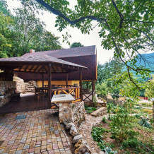 На собственной территории каждого дома вы найдёте беседку, мангальную зону и бассейн для полного релакса. Для Вашего удобства у нас есть парковка, а разнообразие отдыха дополнят баня на дровах, банные чаны.