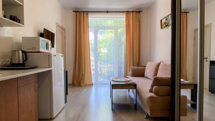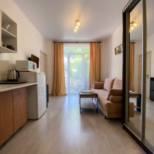 – мини-кухня, холодильник, мойка (хв/гв), микроволновая печь, электрочайник, электрическая или индукционная плита, набор посуды.