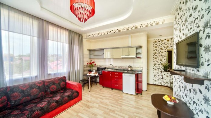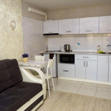 Дизайн-номер с кухней-студио в номере и полноценной возможностью готовить. Выполнен в светлых тонах. Оснащен комфортными спальными местами, платяным шкафом, столом, феном, сейфом, кондиционером, телевизором.