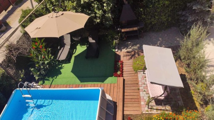 Придомовая территория благоухает в зелени цветущих растений. К Вашим услугам несколько беседок с вечерним освещением, мангалом, зоны отдыха с качелями, детская площадка с бассейном.