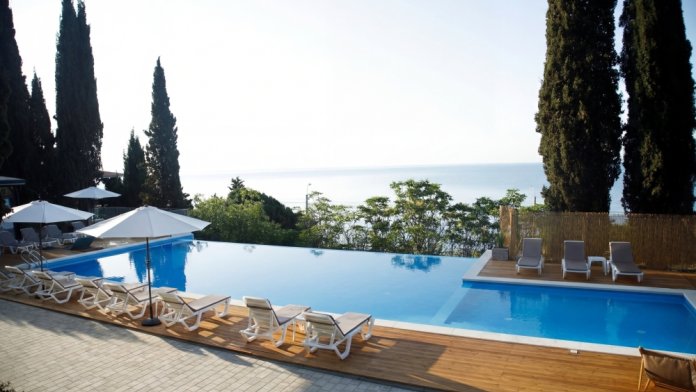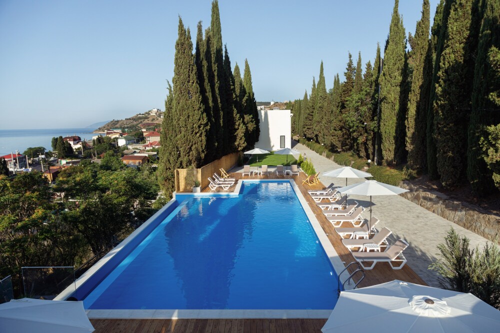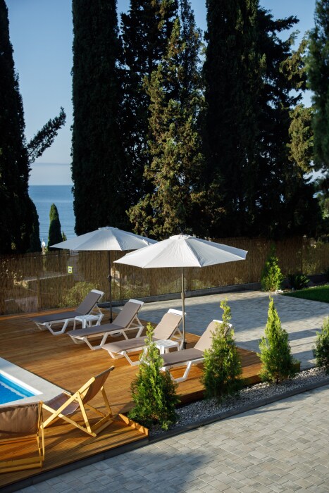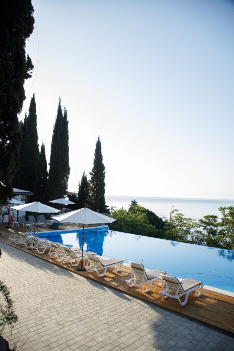 Отель расположен на возвышенности и благодаря этому с любого уголка территории и каждого, без исключения, номера открывается прекрасный вид на море. Расстояние до моря 80 м (45 ступеней). Территория отеля утопает в зелени деревьев и цветущих растений. Вечнозеленые кипарисы насыщают воздух целебными фитонцидами.