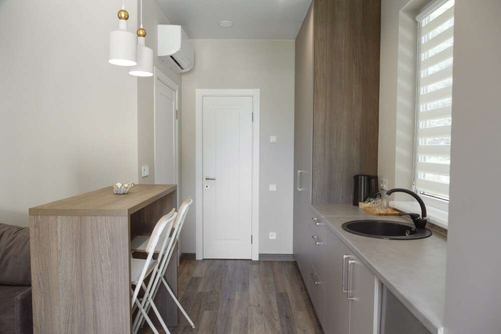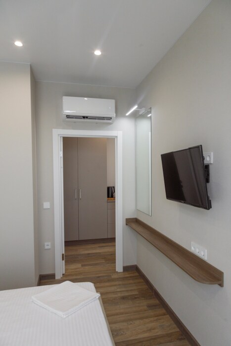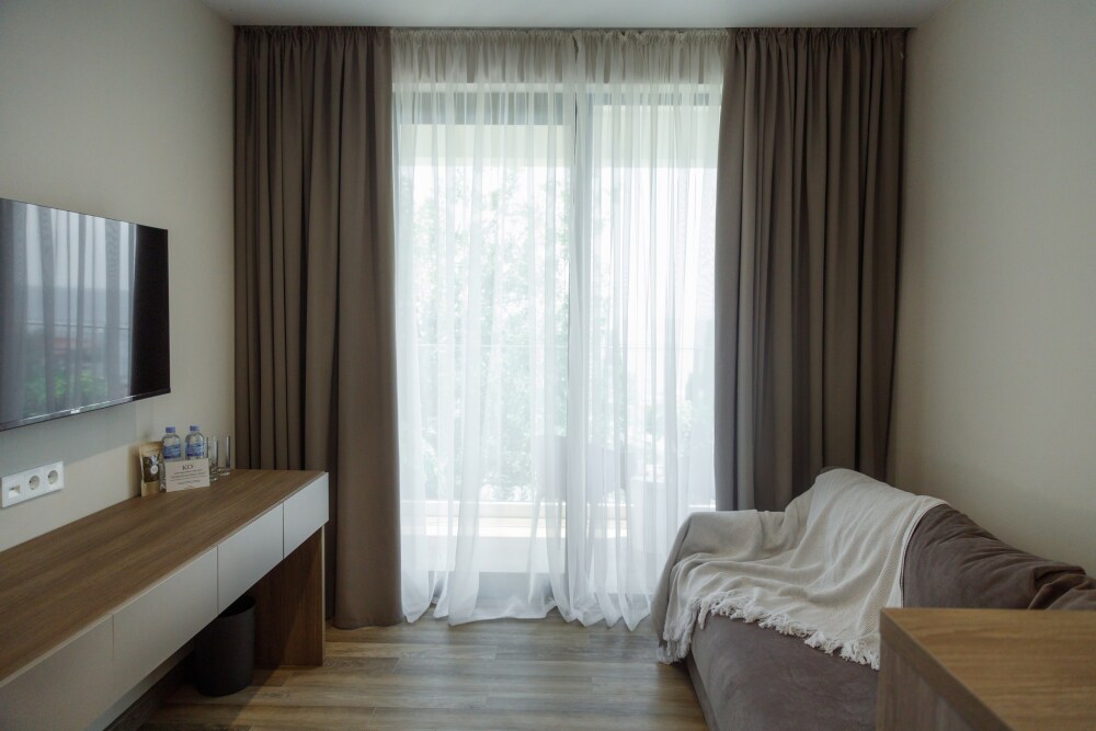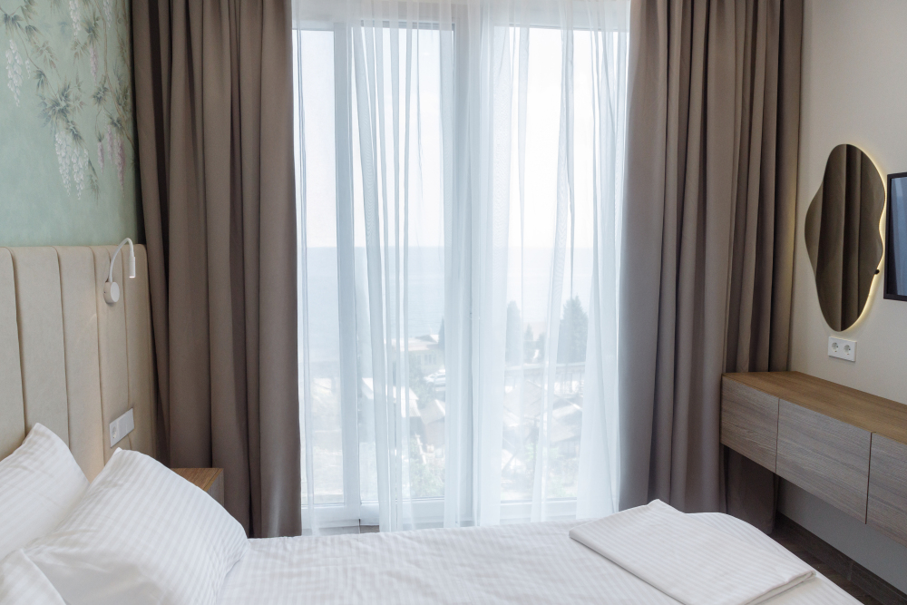 Уютный двухкомнатный просторный номер с гостиной и собственной террасой, панорамным видом на море, расположенный на 1-м этаже корпуса отеля. Оптимальный вариант для троих гостей, семей с детьми или для тех, кто хочет разместиться в более просторном номере