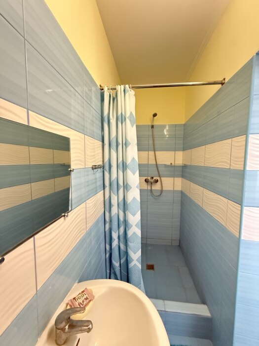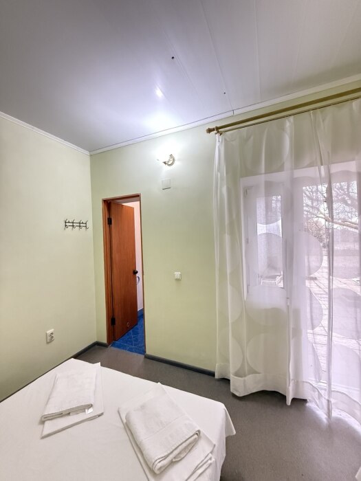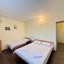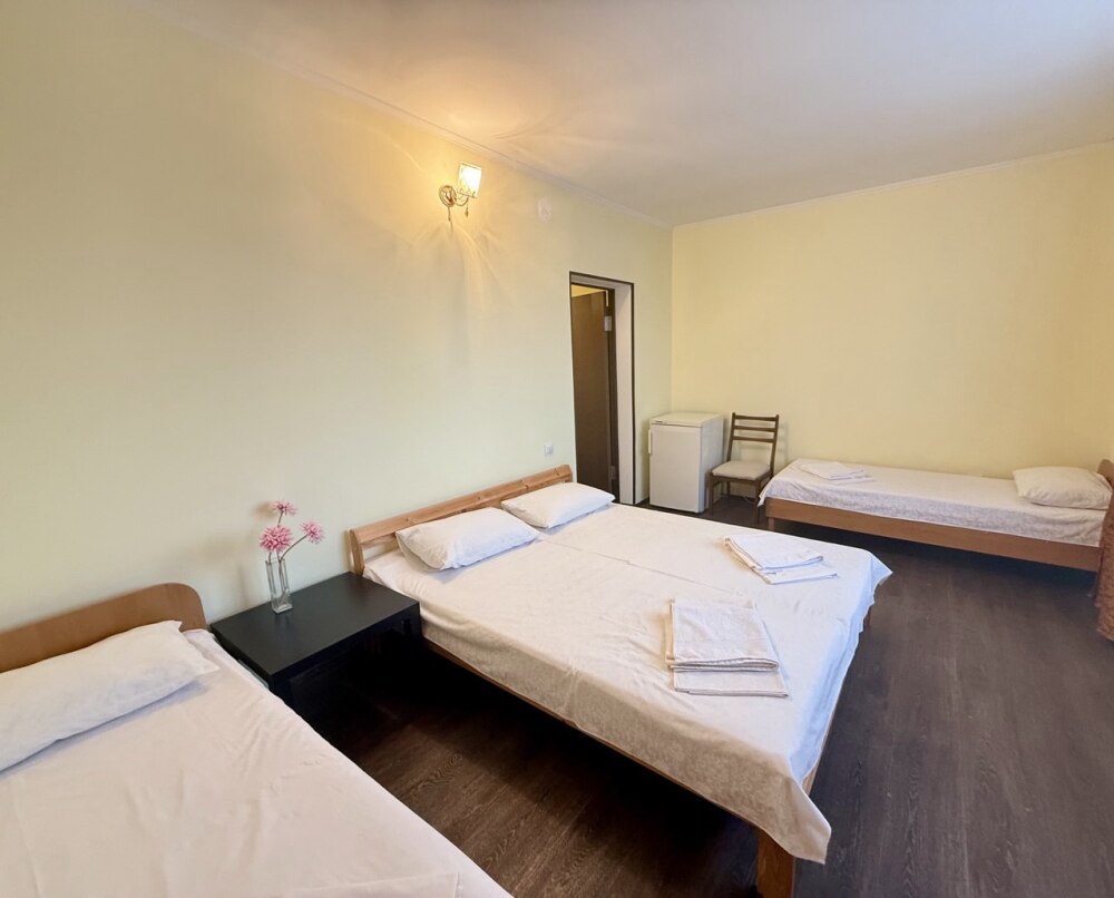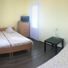 Номер с отдельным входом и собственной террасой. В номере: три односпальные кровати , прикроватная тумбочка, шкаф, стол, 2 стула, холодильник . Санузел- душевая кабина, туалет, умывальник, зеркало. Выход на внутренний двор. Площадь номера 12 кв.м