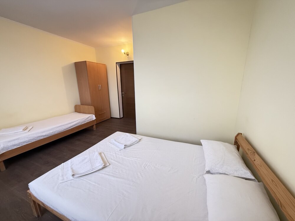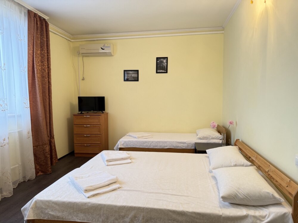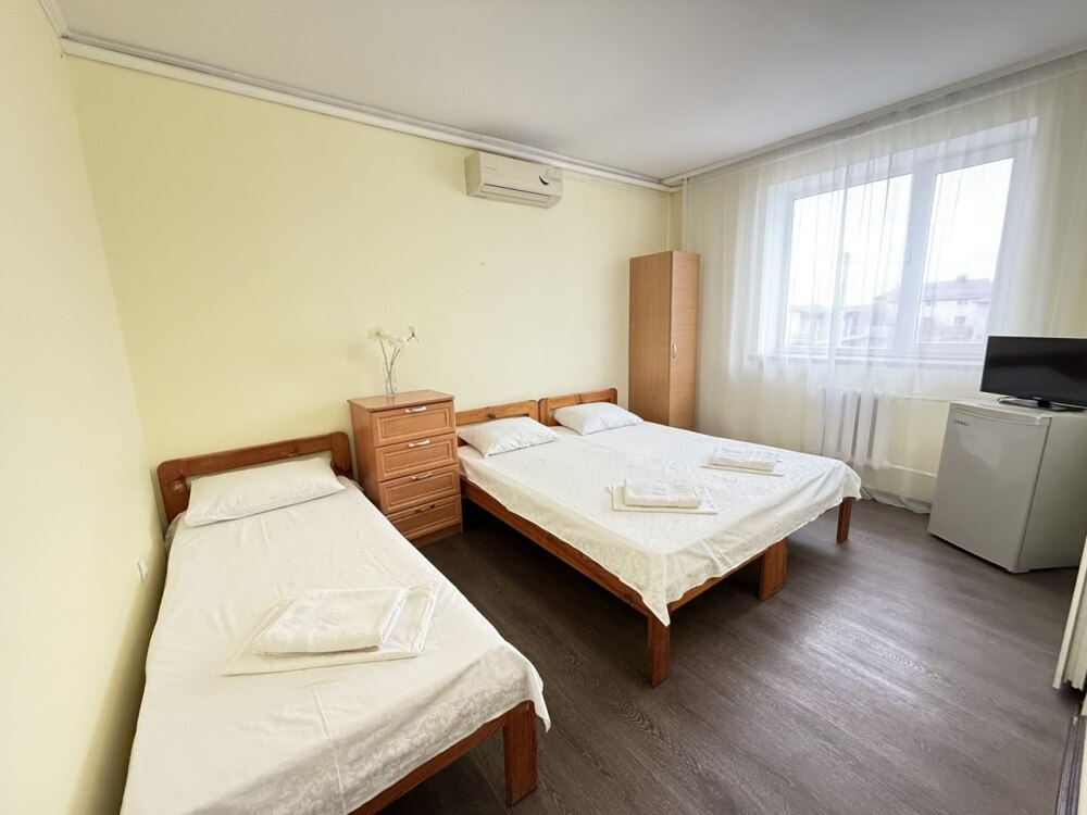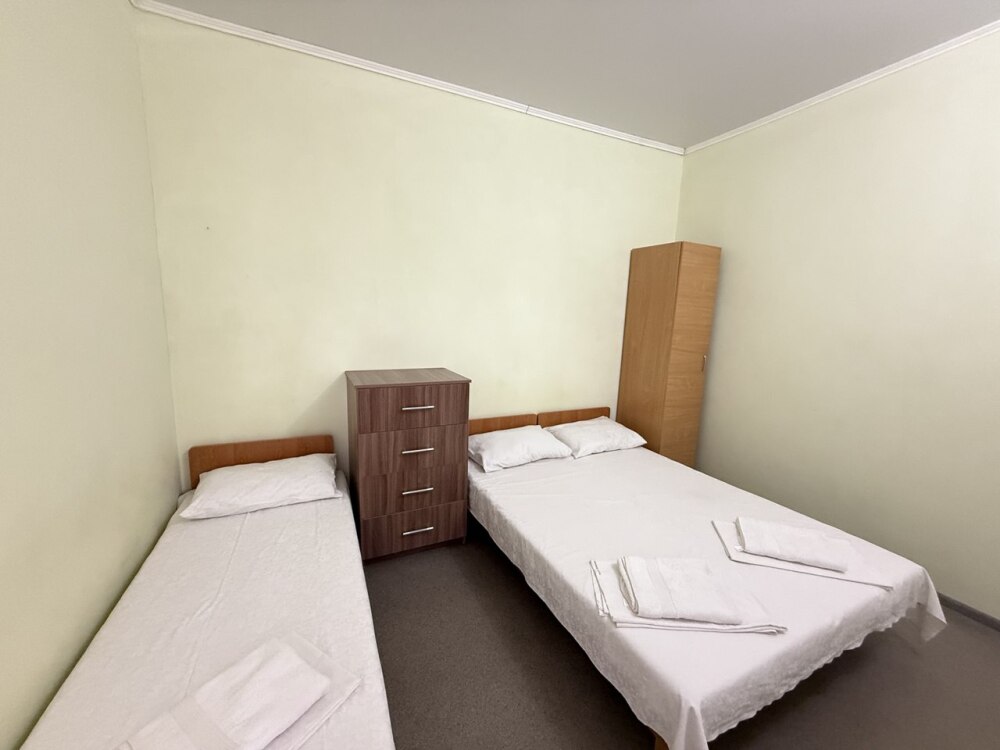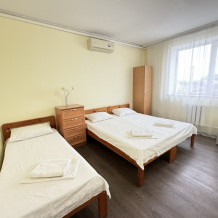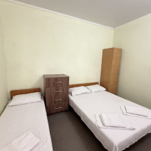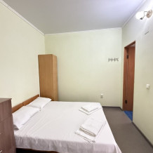 В номере три односпальные кровати прикроватная тумбочка, стул, шкаф, кондиционер, телевизор . Санузел - душевая кабина, туалет, умывальник. Все номера без балкона, вид на поселок или внутренний двор. Площадь номера 14-16 кв. м.